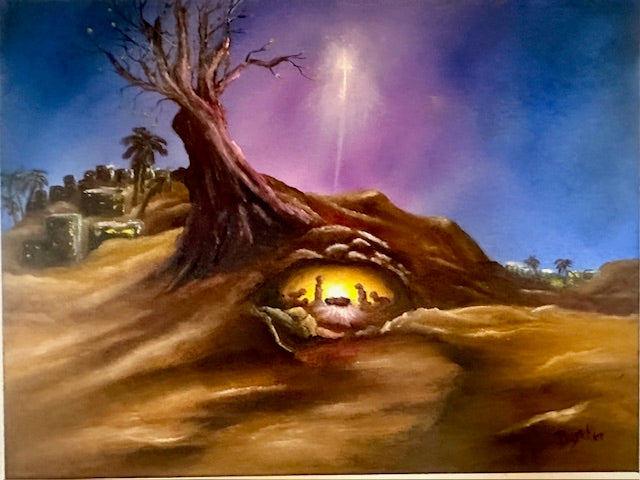 This stunning 18 x 24 gallery canvas captures the sacred moment of Christ's birth with imaginative charm. The intimate scene depicts Jesus, Mary, and Joseph nestled in the humble cave of Bethlehem, while above them the Tree of Life begins to bud with gentle promise. A radiant star shines brilliantly overhead, guiding viewers to this timeless nativity. The distant cityscape of Bethlehem anchors the composition in its historic setting. Perfect for those seeking spiritual art with a touch of whimsy, this oil painting blends reverence with creative wonder, making it an inspiring addition to any gallery wall or sacred space.
