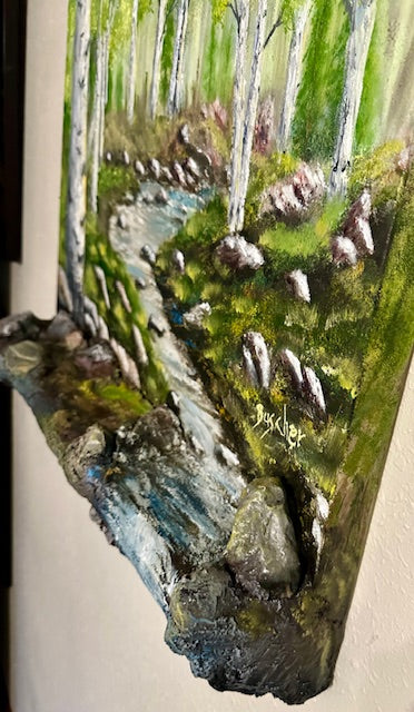 Peaceful Stream brings nature right into your space with a playful twist. This 24 x 24 oil painting captures a serene waterway flowing directly from the canvas onto a sculptural concrete shelf designed to mimic natural rocks. Watch as the painted stream appears to cascade over textured stone, blurring the line between art and reality. A conversation starter that transforms any wall into an immersive landscape experience, perfect for those who love bold, imaginative decor that challenges what art can be.
